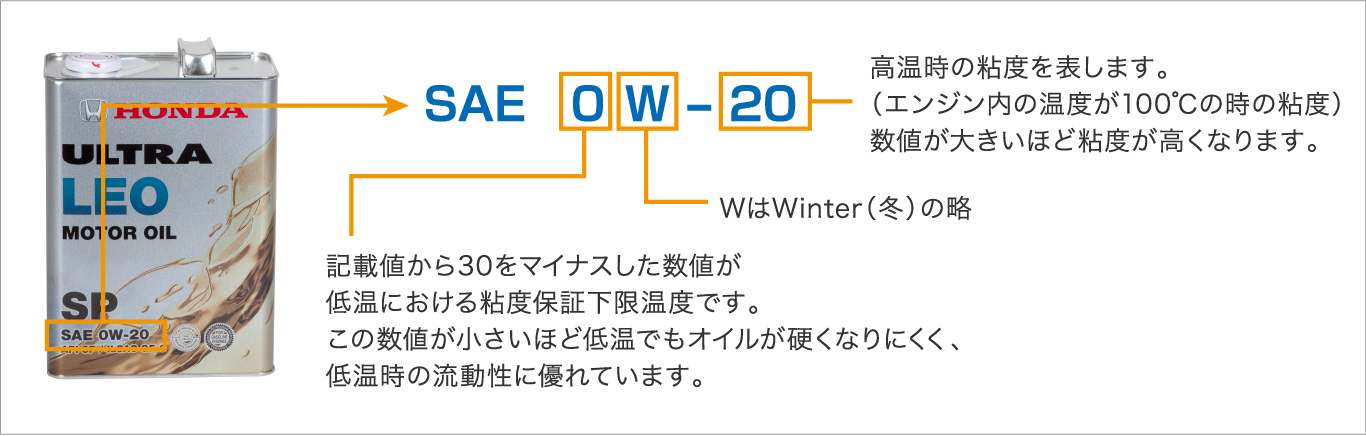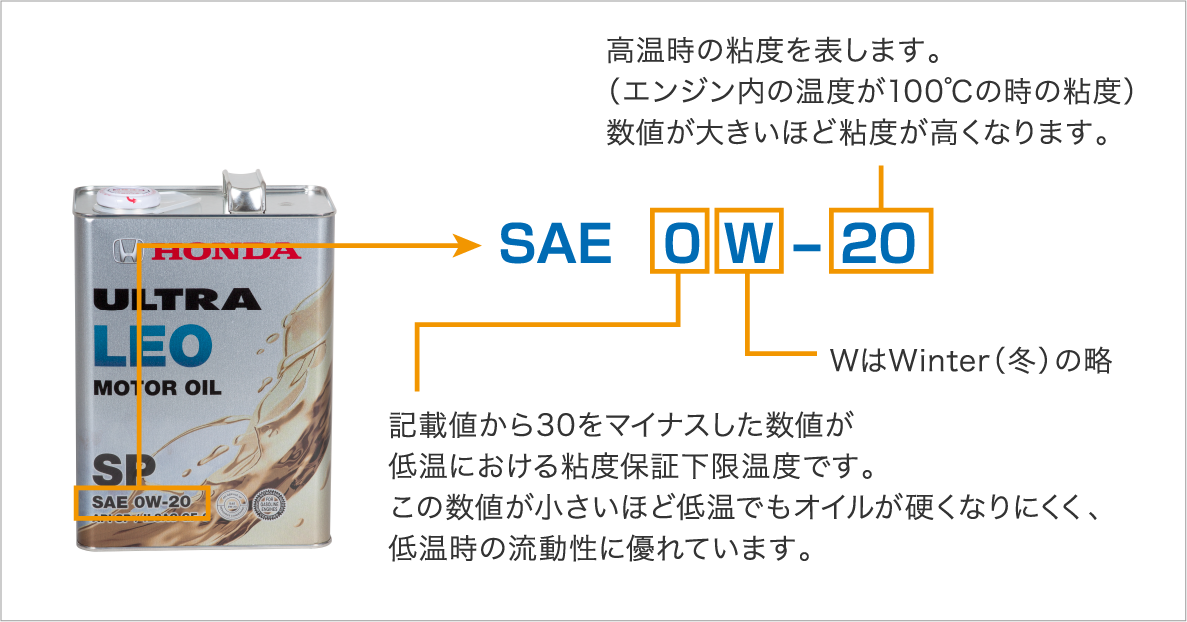 オイルの粘度は、そのオイルの硬さ(ドロドロなのか、サラサラなのか)を示します。エンジンオイル粘度は、SAE(米国自動車技術者協会)によって規格化、分類されており、“0W-20”のように数字とアルファベットで表示されます。ハイフンを挟んで左側の数字は、低温時の粘度で小さいほど柔らかく低温始動性に優れます。このWはWinterの意味です。右側の数字は高温時の粘度で、小さいほど柔らかく低燃費性に優れます。車種により、使用できる粘度が違いますので、車両本体の取扱説明書でご確認いただくか、Honda販売店にお問い合わせください。