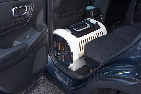 オルくんはクレートに入り、助手席と後部座席の間に固定して、安全に移動します。