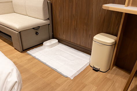 室内には、わんちゃんのためにフードボウルと水入れだけではなく、トイレシートやフタつきのゴミ箱が完備されていますので、とても衛生的です。