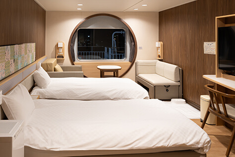 <大阪―別府>間を結ぶ「さんふらわあ くれない」では、ワンランク上のお部屋「デラックスウィズペットルーム」があり、ホテルのように広々としています。