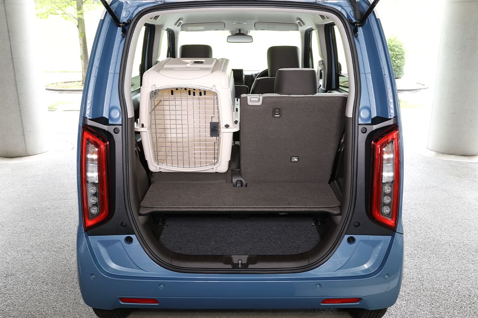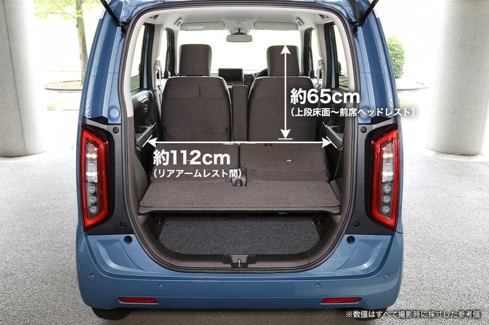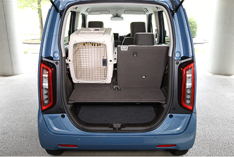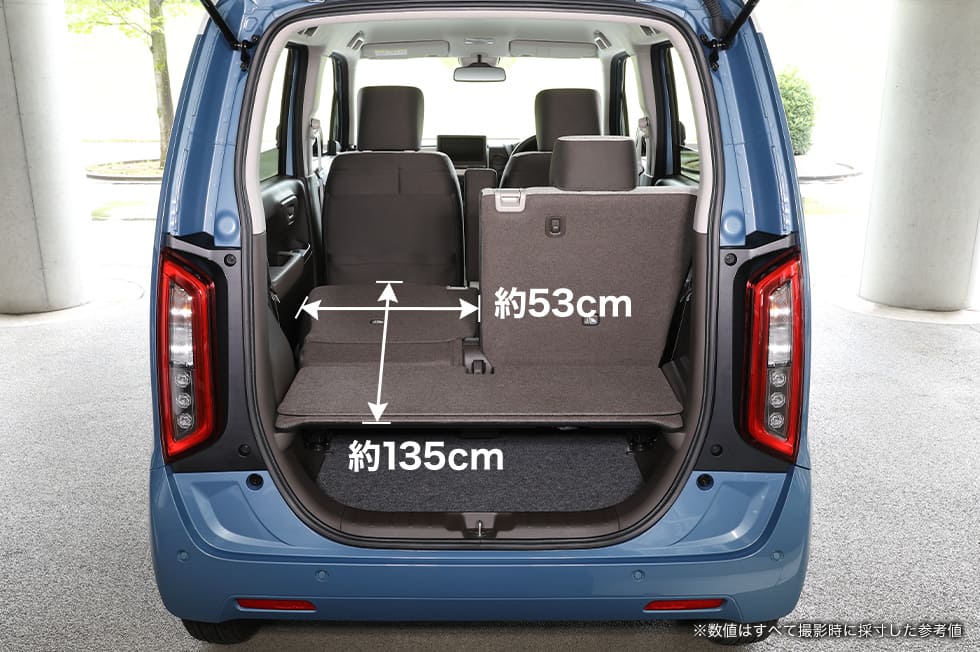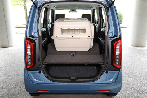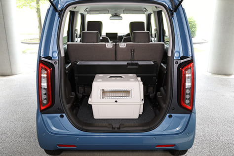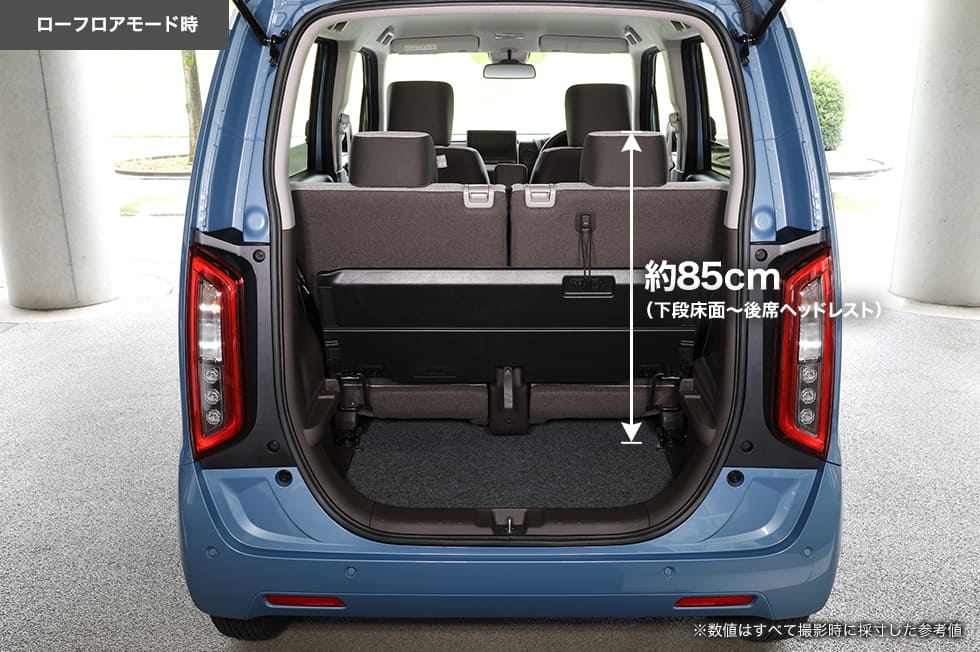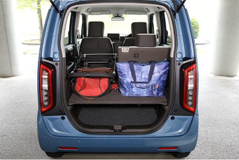 後席両側の背もたれを前に倒せば、さらにラゲッジスペースは拡大。ほぼ段差のない広い空間は、大きな荷物に対応でき、下段スペースも同時に使えます。