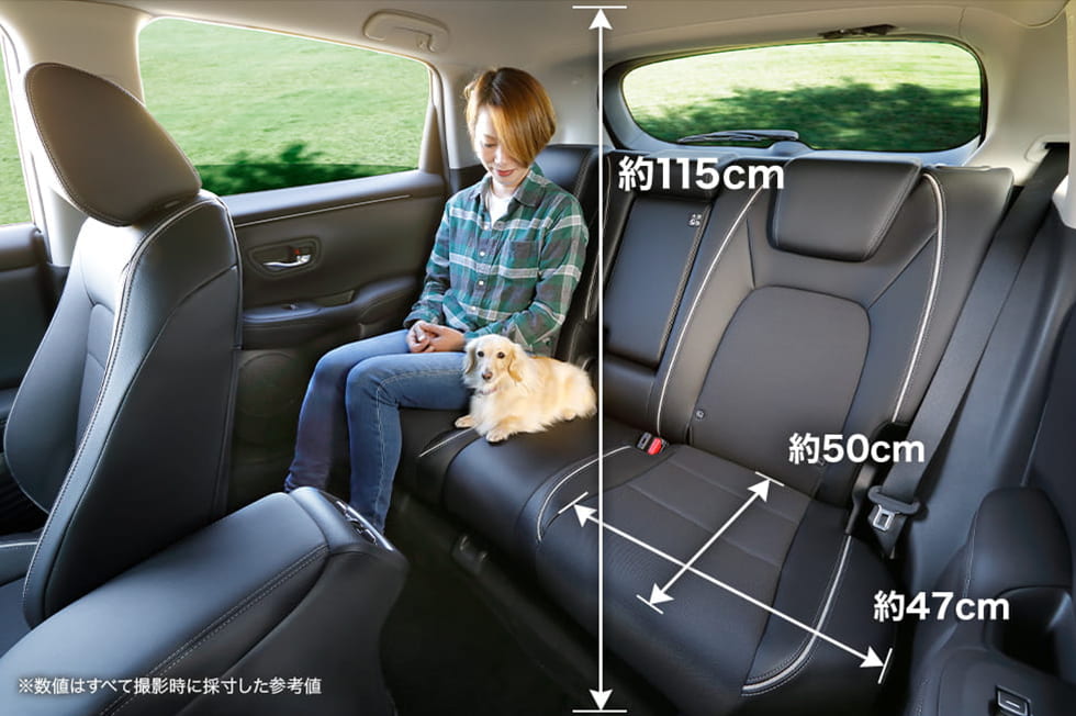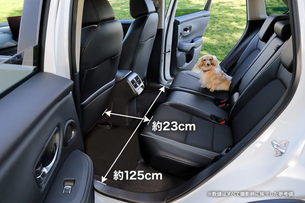 座面の幅も奥行きもワイド、背もたれもしっかりで、座り心地のよいリアシート。頭上にもゆとりがあり、わんこと並んでゆったりくつろげます。