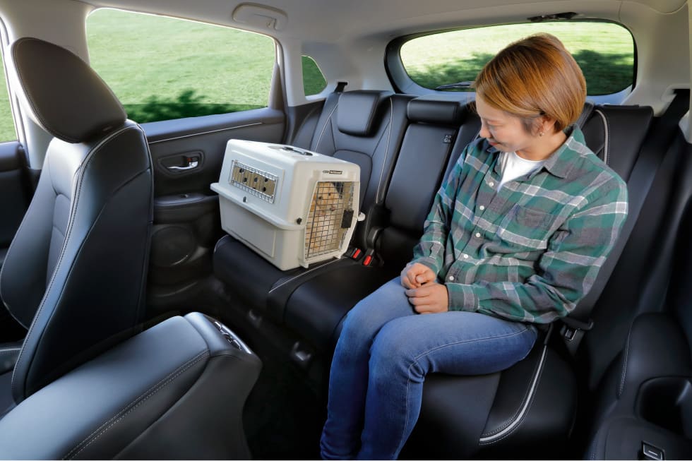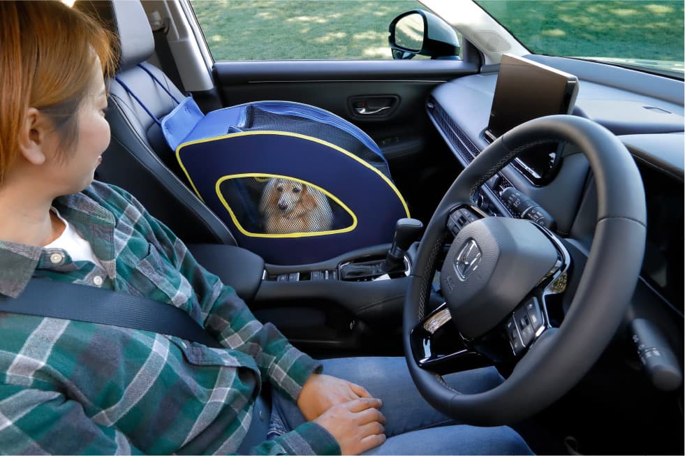 わんこを助手席に乗せて一緒にドライブを楽しめるHonda純正アクセサリー、「ペットシートプラスわん2」に対応。側面がメッシュになっているのでお互いの様子を確認しやすく、わんこもリラックスして乗車できます。