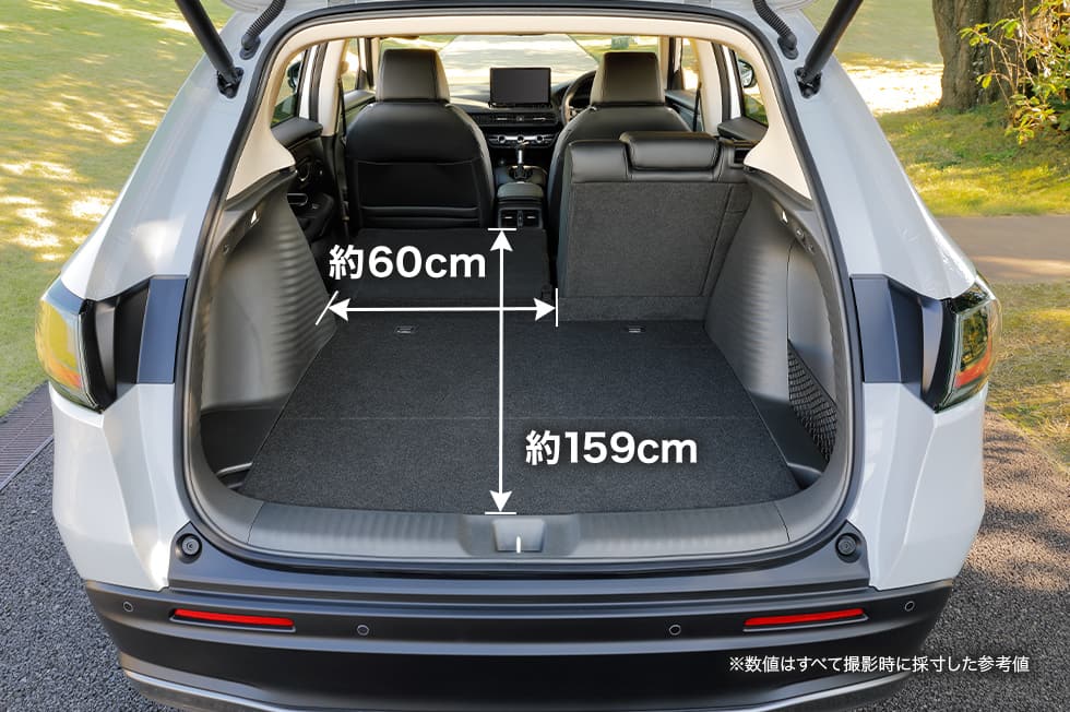 リアシート左右肩口のレバーを引くだけの簡単操作で両側の背もたれを前に倒せば、荷室スペースは最大に。キャリーケース(大型)を縦向きはもちろん、横向きにも載せられます。