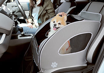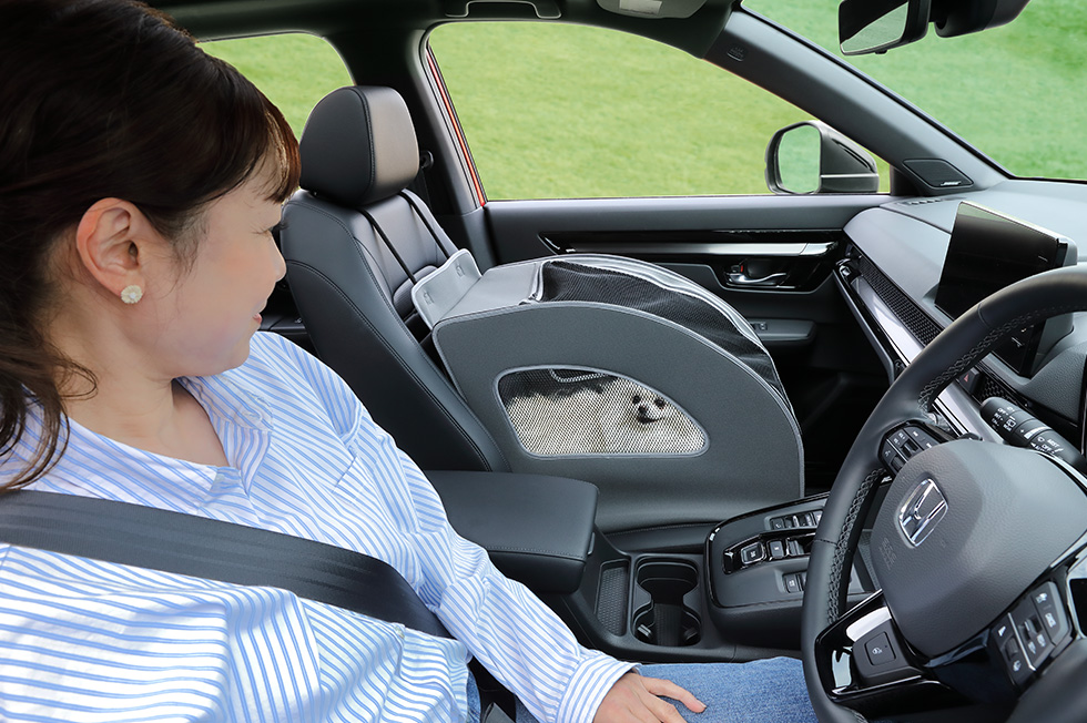 わんこを助手席に乗せて一緒にドライブを楽しめるHonda純正アクセサリー、「ペットシートプラスわん2」に対応。側面がメッシュになっているのでお互いの様子を確認しやすく、わんこもリラックスして乗車できます。