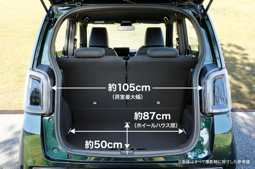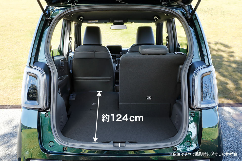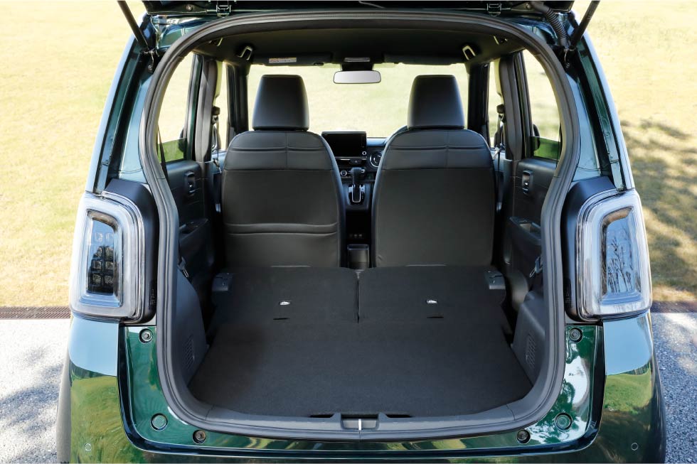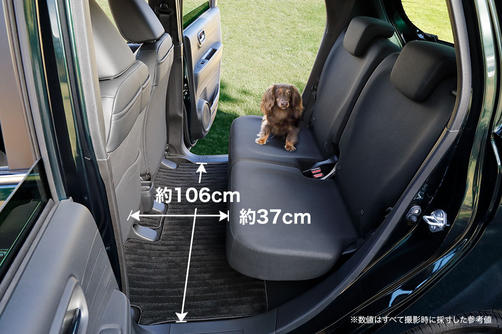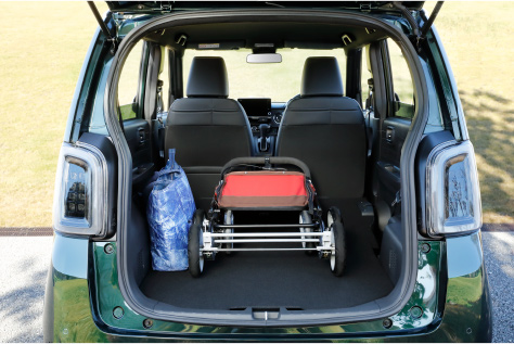 後席を片側だけ倒せば、わんこを後席に乗せつつ、カートを立ててすっきり収められます。おさんぽグッズやおもちゃなどもたっぷり積んで出かけられます。