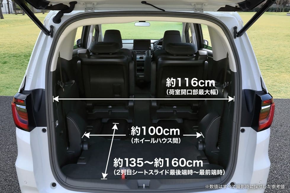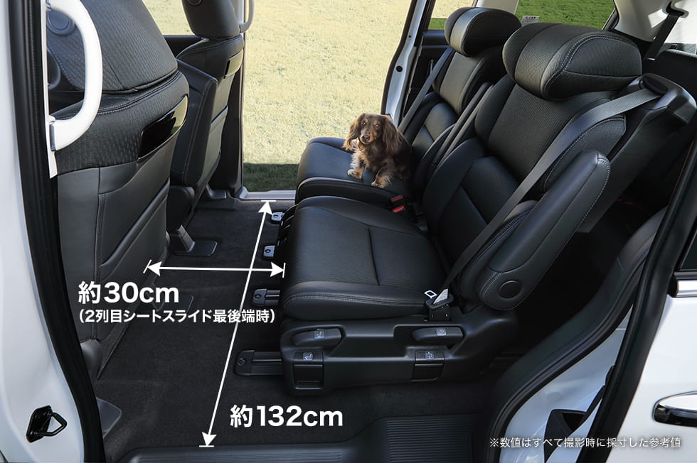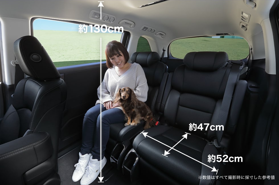 左右席で別々にスライドすることができ、前席との距離や荷室長を調節できます。足もとやひざまわり、頭上にもたっぷりと余裕があるので、わんこと並んでゆったりくつろげます。