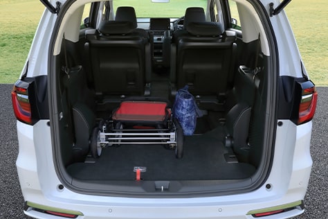 テールゲートの開口が大きく、床も低いので、キャリーケースやカートなどの荷物を出し入れしやすく、わんこと一緒のおでかけに大活躍。キャリーケース(大型)を縦向きでも横向きでも載せられ、カートは寝かしてゆったりと積載できます。おさんぽグッズやおもちゃなどもたっぷり積んで出かけられます。