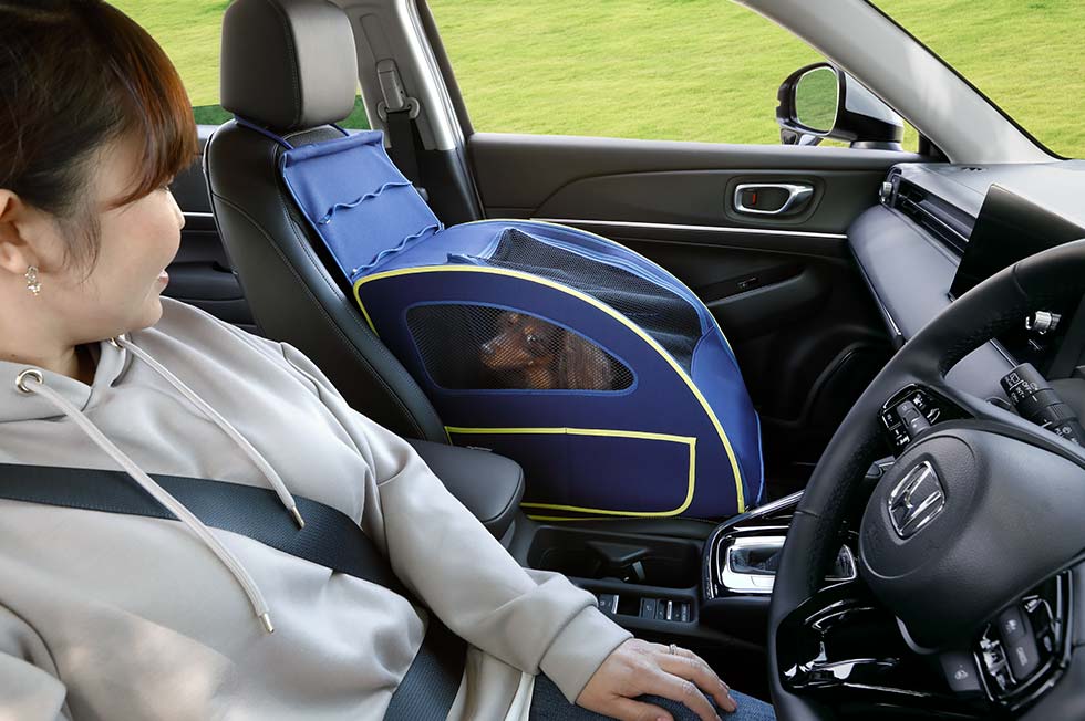 わんこを助手席に乗せて一緒にドライブを楽しめるHonda純正アクセサリー、「ペットシートプラスわん」に対応。側面がメッシュになっているのでお互いの様子を確認しやすく、わんこもリラックスして乗車できます。