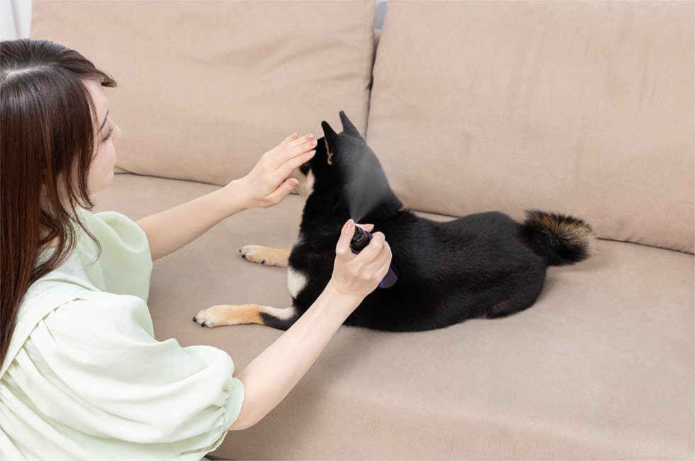スプレー液を使用期限までに使い切れない場合、ドッグカート、ペットベッド、洋服、リードなどに噴霧することをおすすめします。また、ブラシにスプレー液を噴霧してブラッシングすると、リラックス効果が得られるだけでなく、摩擦による静電気の発生も防げます。