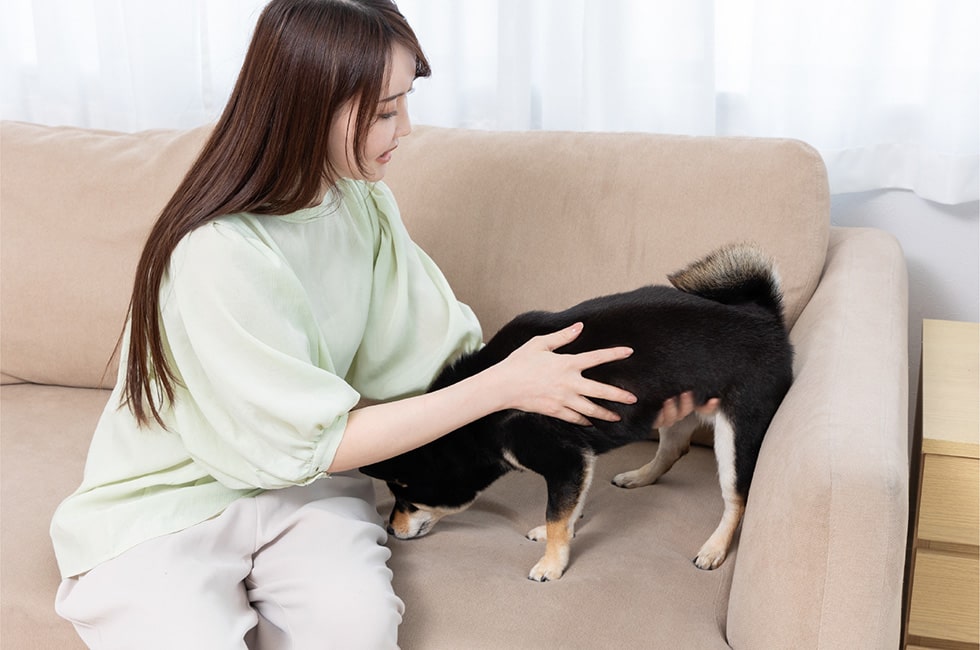 スプレーはおなかや足に直接噴霧するのではなく、犬の背中やお尻に吹きかけ、手で塗り広げます。犬は毛並みを乱されるのを嫌うので、毛並みに沿って塗布しましょう。