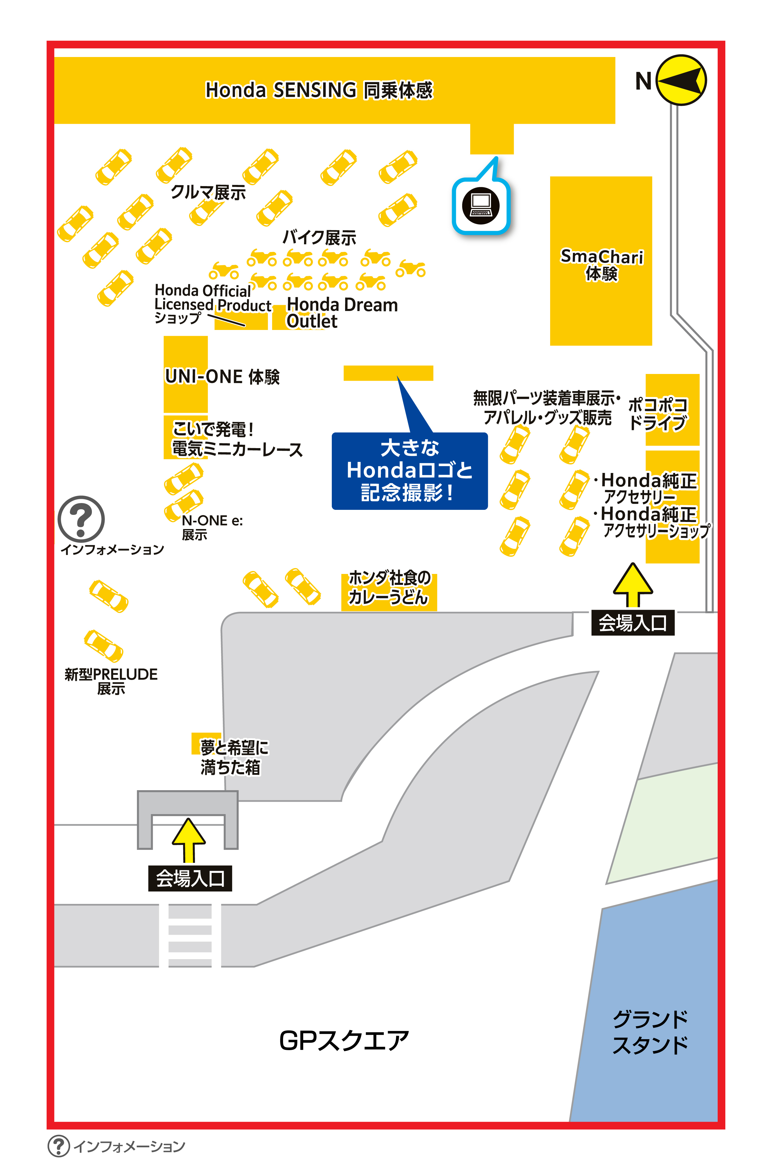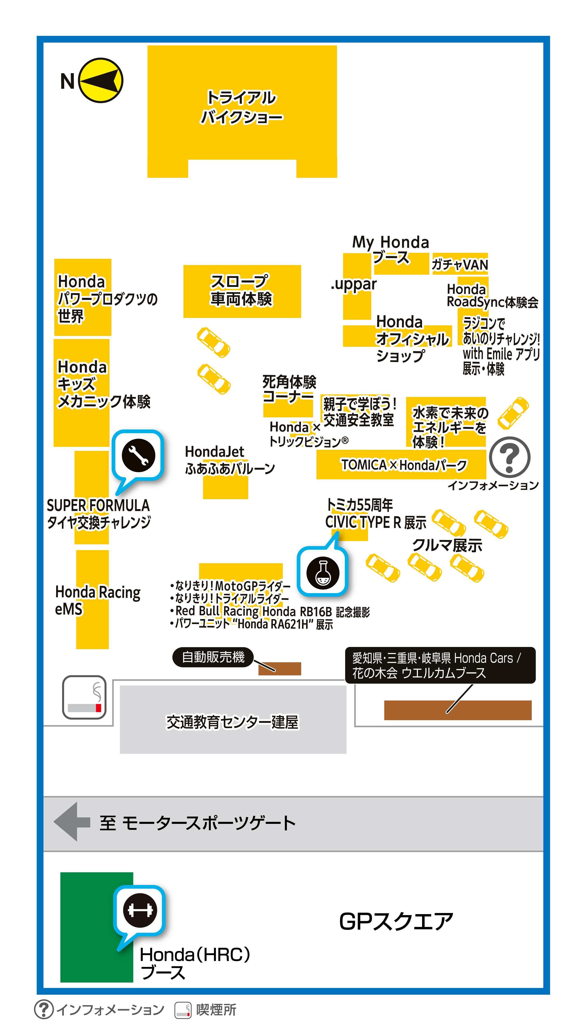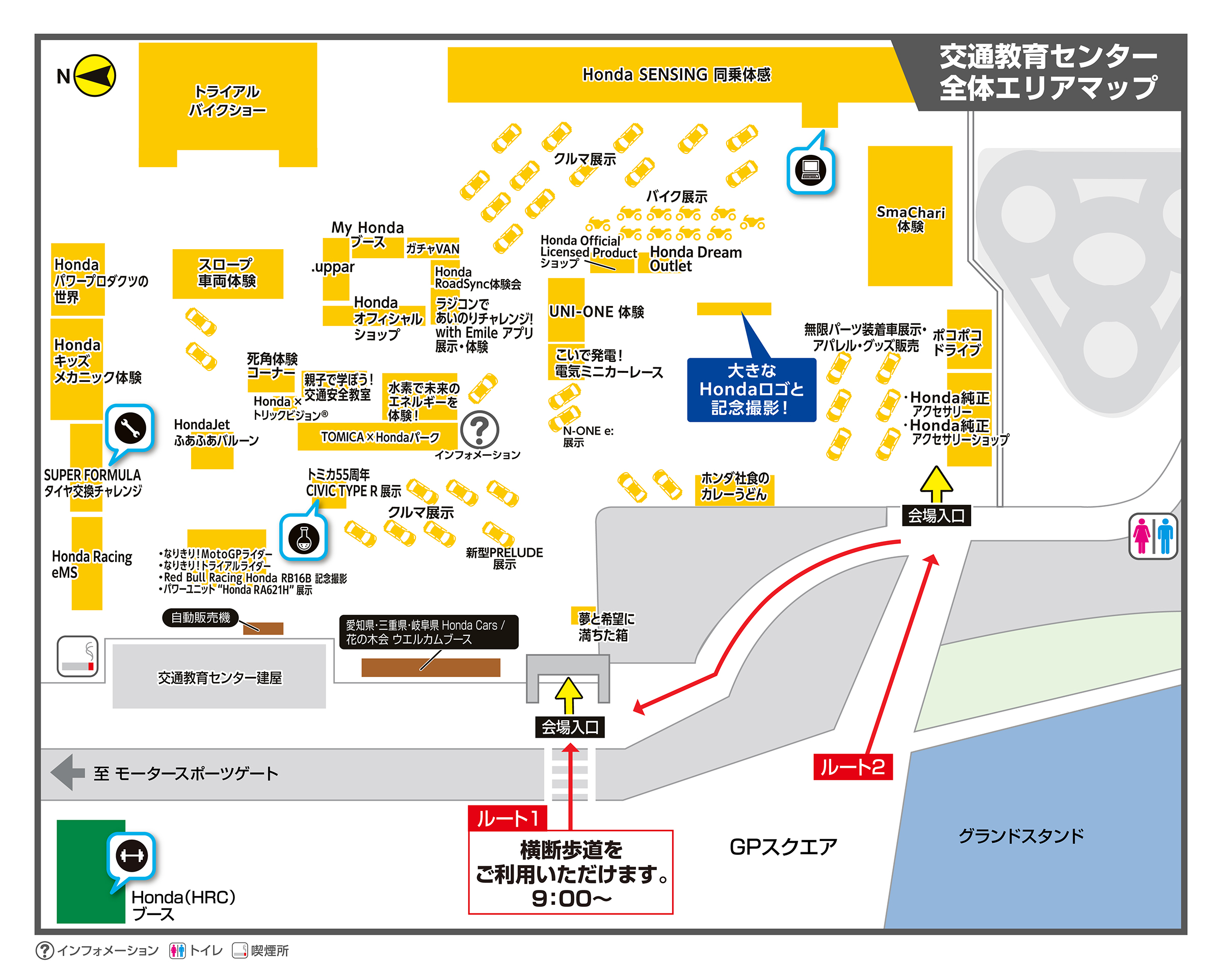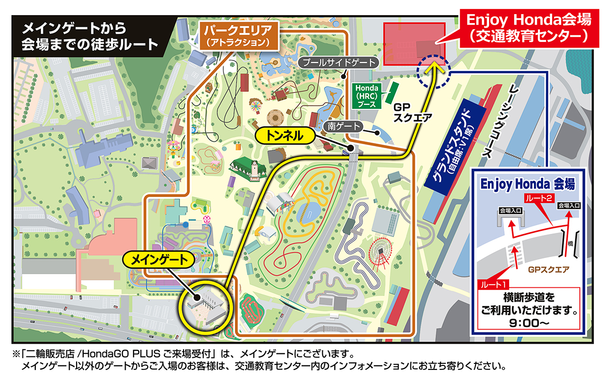 ※「二輪販売店/HondaGO PLUSご来場受付」は、メインゲートにございます。 メインゲート以外のゲートからご入場のお客様は、 交通教育センター内のインフォメーションにお立ち寄りください。