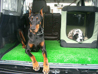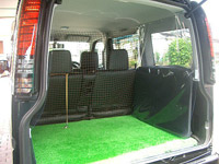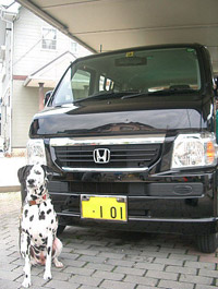 購入後は、早速、ラズ&ベリー仕様に車内をカスタマイズ。人工芝を敷いたり、顔出し防止のために、網とテーブルクロスでガードしたりと創意工夫。手間はかかったけどカスタマイズのイメージを膨らませていたので、上手に仕上げることが出来たと思います。このちょっとした工夫が、犬を乗せるクルマには大切ですよね。人も犬も無理のないことが一番大事!そのおかげで、子ども2人、犬2匹、気軽にそれぞれの場所に乗り込み、自然にお出かけを楽しめています!そうそう、ナンバープレートも希望のナンバーを取ることができました。もちろん!101!ダルメシアンナンバーですよ♪