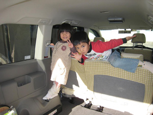 納車後は、家族5人楽しくドライブできるようになりました。フィットでは、運転席と後部中央に大人、助手席と後部左右に子供が座っていましたが、現在は運転席・助手席に大人、後部2列目に子供を3人並べて座らせています。チャイルドシートが必要な下の子2人は3点式ベルトのある左右席に座り、大分大きくなってきちんと座れる上の子を中央席に座らせ、2点式ベルトをしています。そのため普段は3列目を収納し広々とした荷室を贅沢に使っています。両親や友人が乗るときは、引き出した3列目に子供を乗せ、お客さんが2列目というようにしてフル乗車しています。