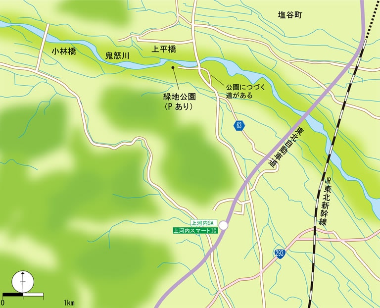 東北道の上河内スマートICから、県道63号線を経由して鬼怒川の上平(うわだいら)橋方面へ。上平橋の手前に右に入る側道があり、そこに入ると橋の下をくぐって右岸にある緑地公園に出られる。その緑地公園の突きあたりに広い駐車スペースがあり、目の前が鬼怒川。そのほか、上流の小林橋の付近なども、川原に降りられるので、どこでもプールを見つければ釣りが可能。遊漁券は塩谷町内のコンビニなどで販売している(日釣券1400円)。解禁:3/1~9/19