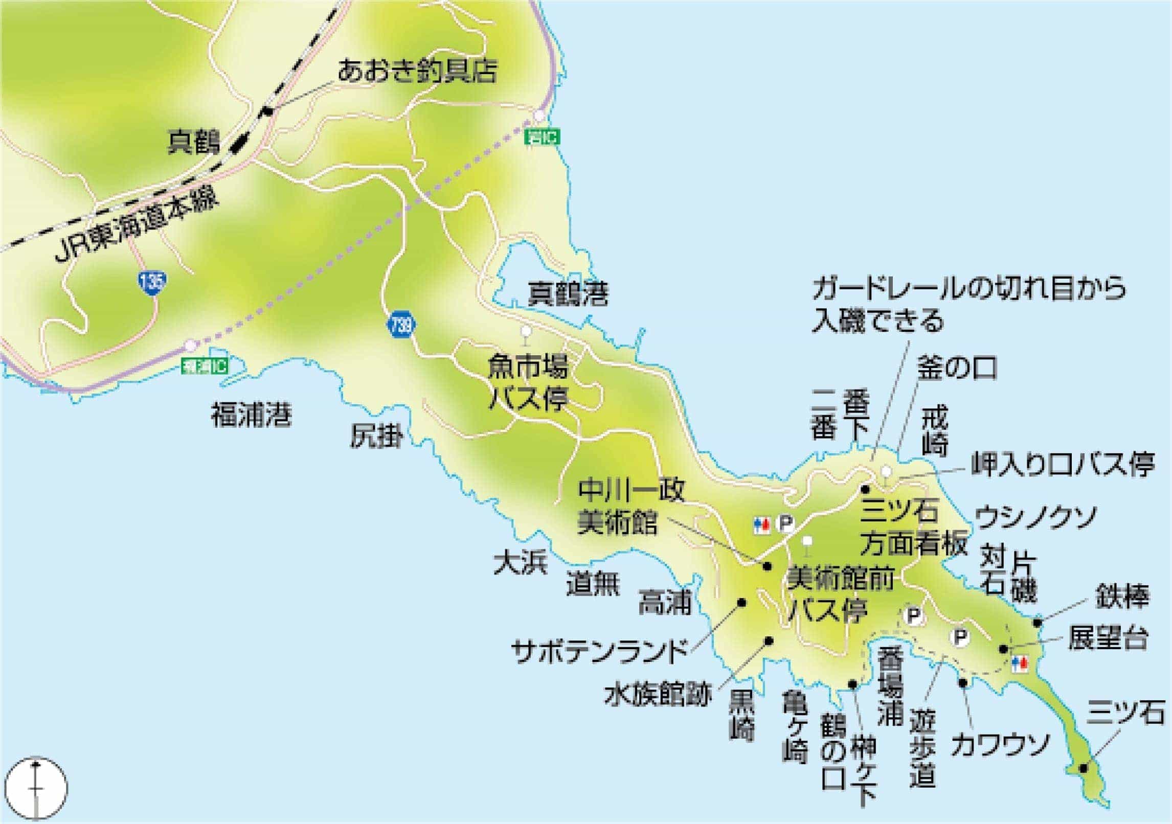 真鶴半島は南東方向に伸びています。最先端は三ツ石という釣り場で、ここはメジナにかぎらず、スズキメバルアオリイカなどの好ポイントですが、干潮時の潮位の低い時間帯のみ歩いて渡礁でき、潮位が上がると行き来できなくなります。ベテラン向きの釣り場なので、ビギナーは必ず上級者と同行してください。三ツ石以外でも、鉄棒、カワウソ、榊ケ下、対石、亀ケ崎など半島の東西南北に好釣り場が点在しています。中でも鉄棒、カワウソは足場もよく、入りやすくオススメです。ただし、冬場は風が強い日が多く、基本的には風裏の釣り場でサオをだしたほうが安全に快適に釣りを楽しめます。