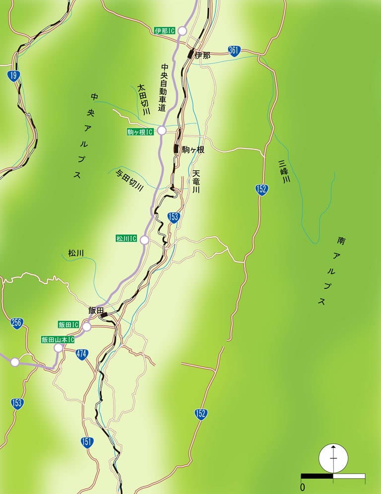 中央自動車道の伊那IC~松川ICの区間は、天竜川とほぼ並行して走っている。三峰川へは伊那IC、太田切川へは駒ヶ根IC、松川へは松川IC利用が便利。