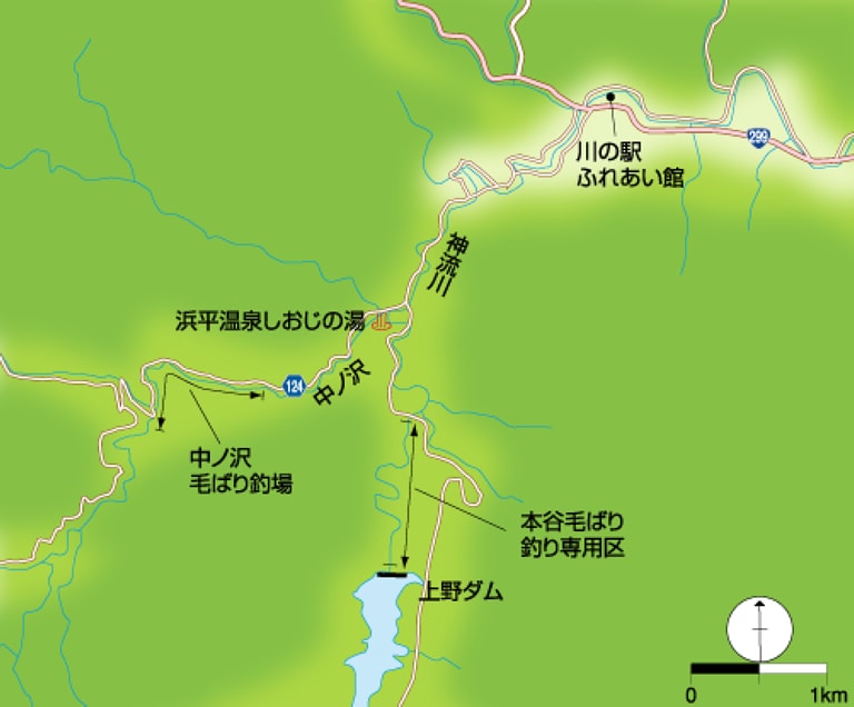 上信越自動車道・下仁田ICを降りてR254を左折。下仁田の交差点を左折して、県道45号に入る。そのまま上野村方面へ向かい、R299に出たら左折すると『川の駅 ふれあい館』がある。そこから各釣り場へ向かうとよい。