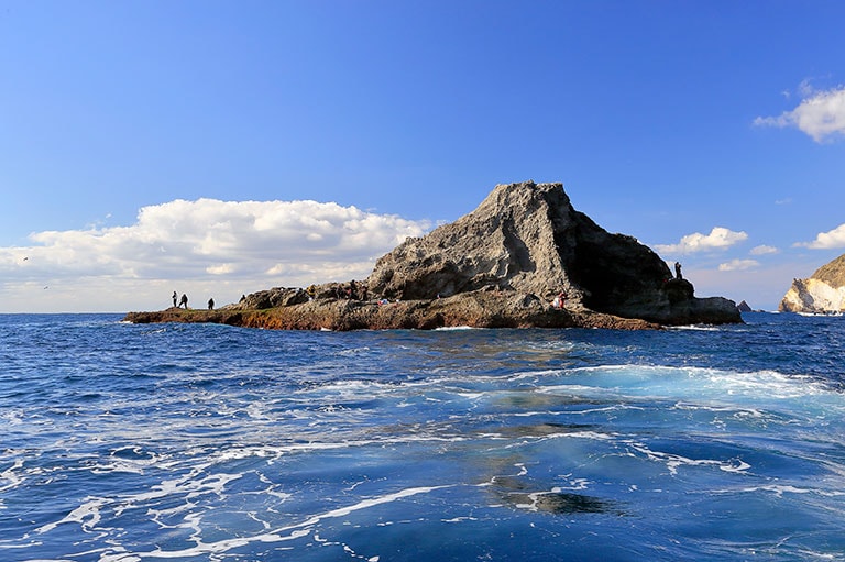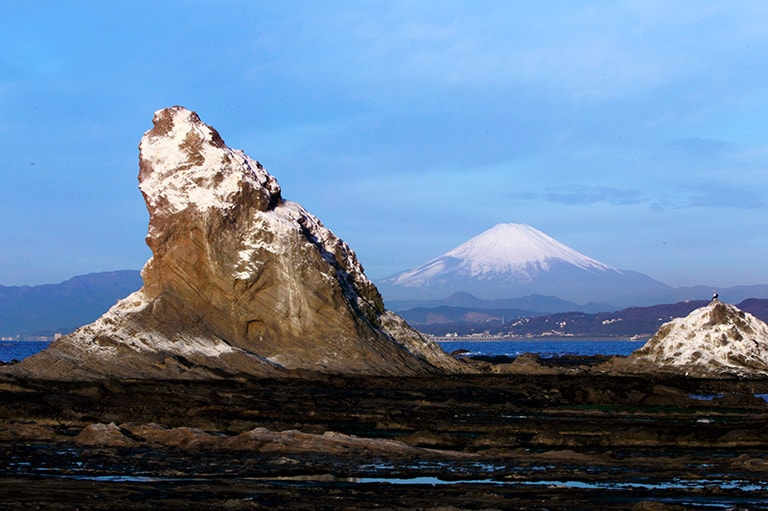 茅ヶ崎港から船に乗り、磯釣り場としてよく知られる烏帽子岩へ。心地よい磯風を感じながら、富士山を背にメジナとカワハギをねらう。