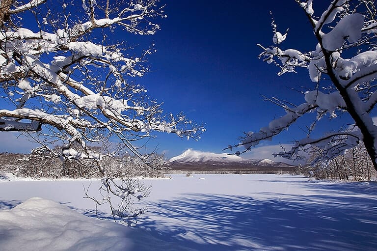 日本新三景のひとつ、七飯町の大沼は、氷上釣り場が多い北海道のなかでもワカサギの魚影がすこぶる濃いことで知られる。雪化粧をした駒ヶ岳を背に銀鱗をねらう。