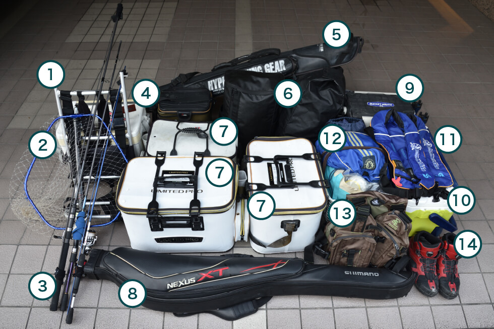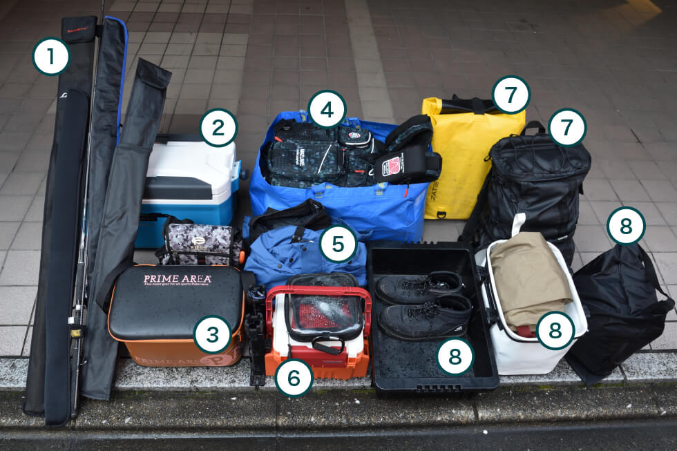 ベテランチームは伊豆半島の中でも東~南伊豆エリアを転戦する作戦を立てた。起伏に富んだ地磯や周辺のゴロタ浜などでの釣りに備えつつ、多彩な魚が回遊してくる親水公園や堤防での釣りも視野に入れる。本格的な磯のウキフカセ釣りができるように、大型のバッカンや背負子も準備した