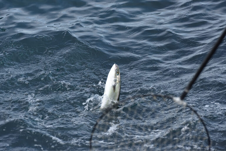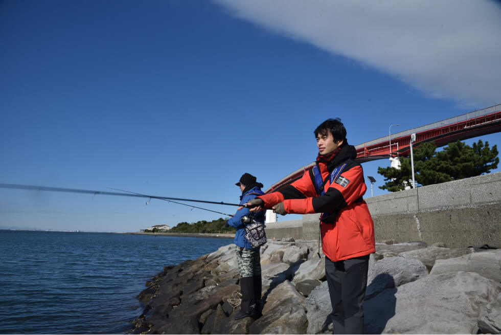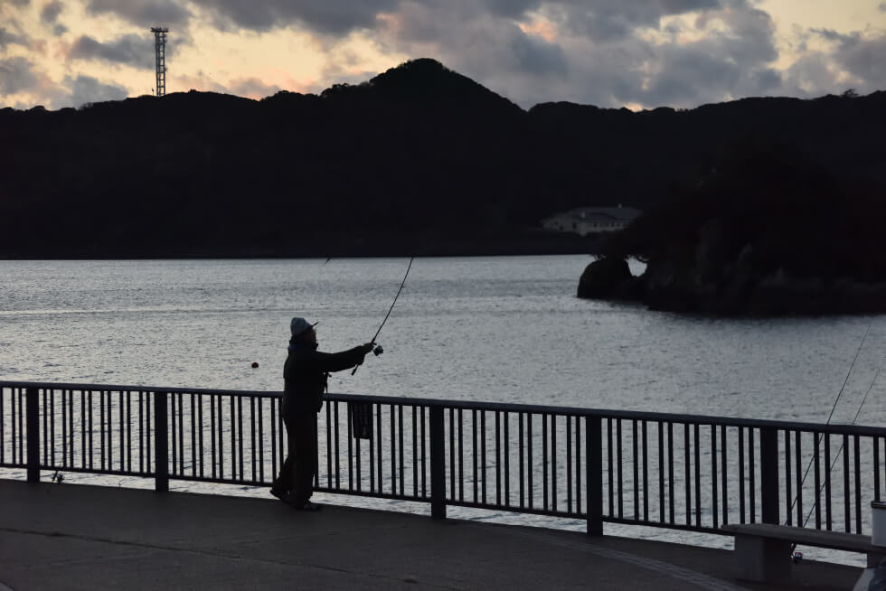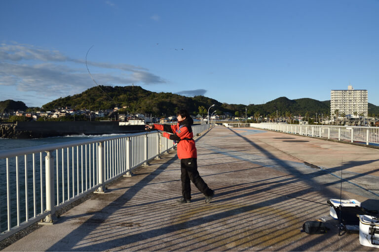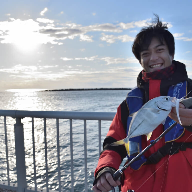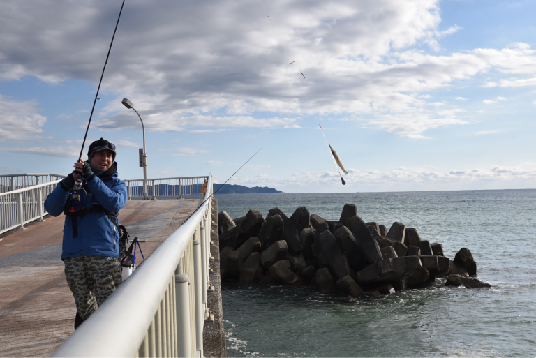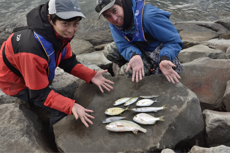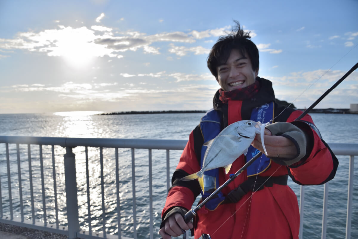 ベテランチームにはヒットしなかったが、この日のいるか浜堤防にはイナダの回遊があり、時折エサの小魚を追うナブラが発生。ネンブツダイを釣って磯ザオで泳がせていた地元のベテランが見事にキャッチしていた