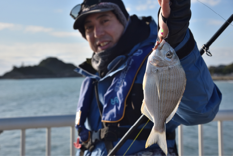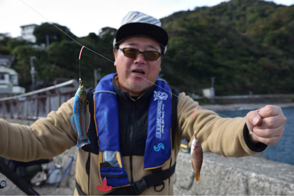 カワハギを期待してドウヅキ仕掛けを投入した天野にヒットしたのは定番ゲストのベラ。こちらはノーカウントとした