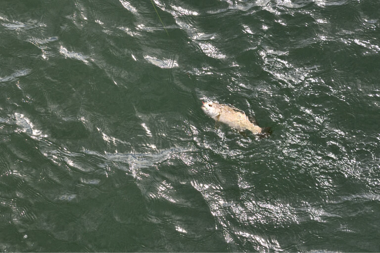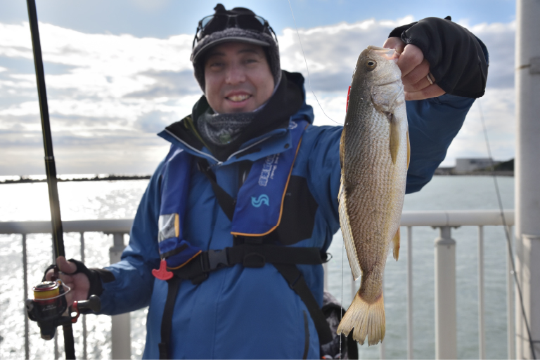 慎重にリールを巻き上げると、海面に浮かび上がったのは太ったイシモチ!