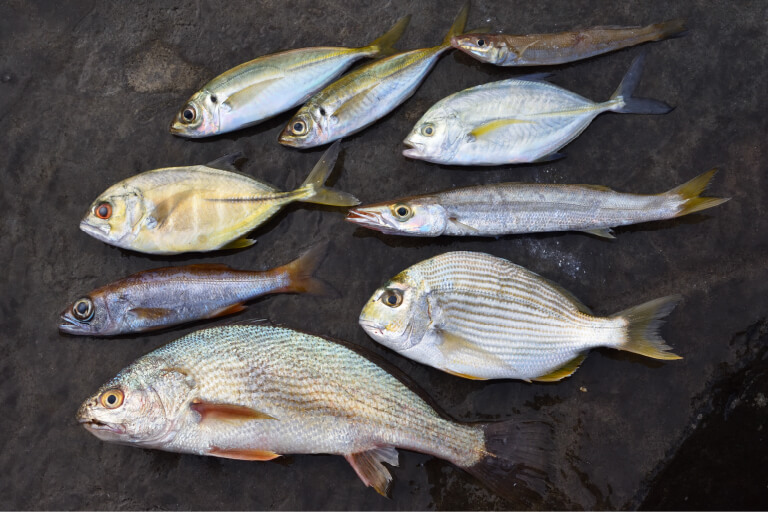 2日間の釣りで釣りあげたのは、(左上から時計周りに)アジ(2尾)、シロギス、カスミアジ(メッキ)、カマス、ヘダイ、イシモチ、ムツ、ギンガメアジ(メッキ)の8種!