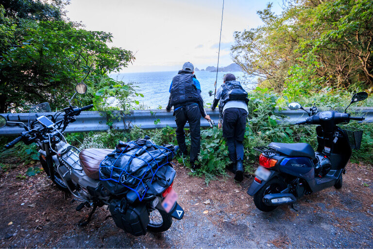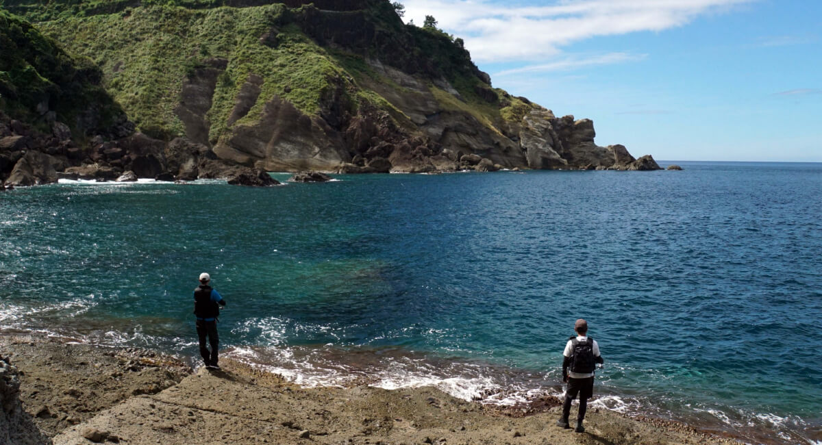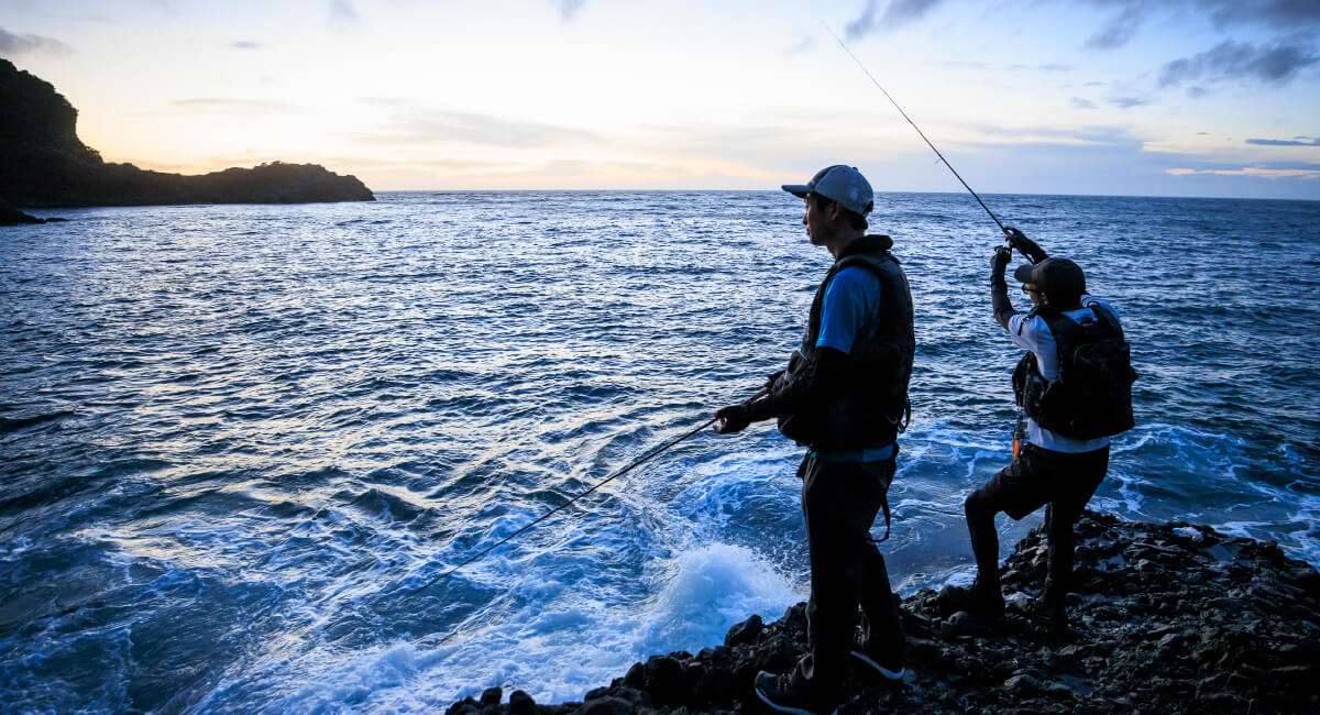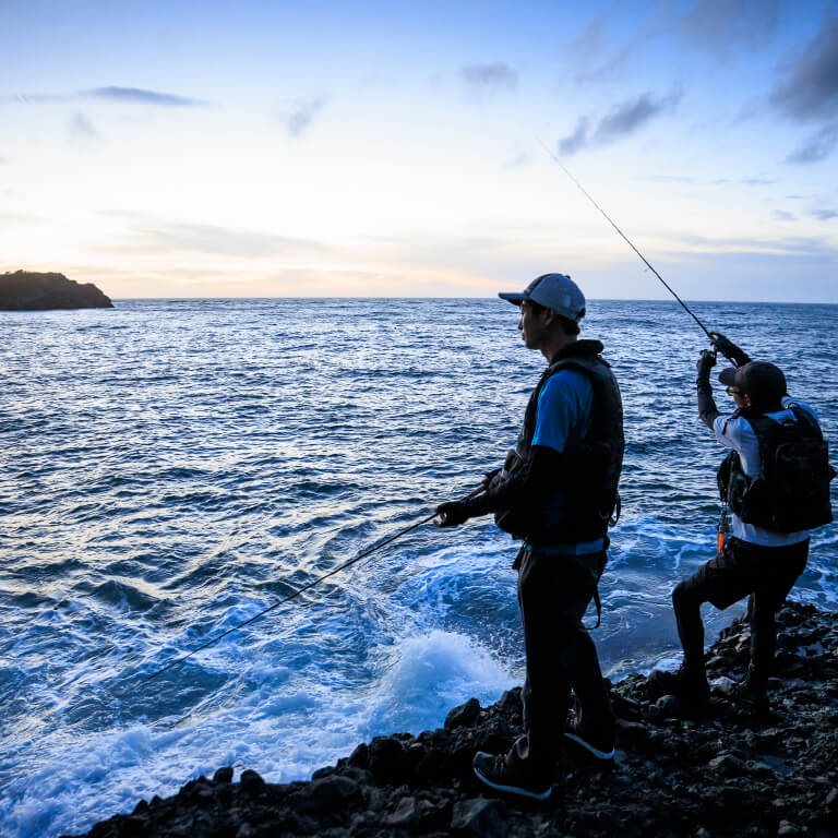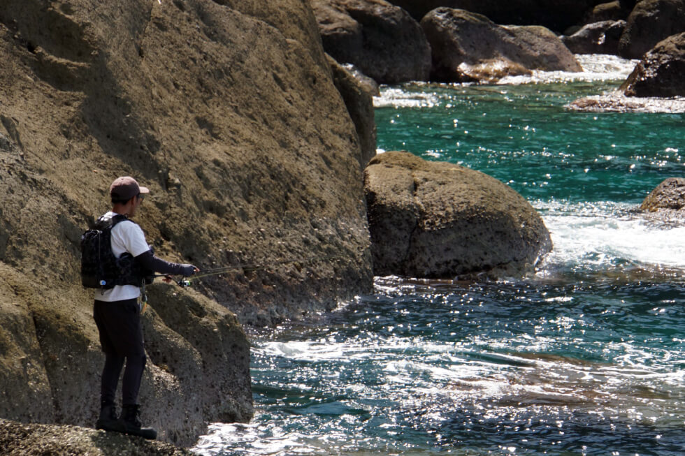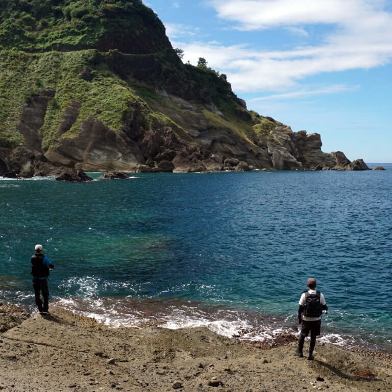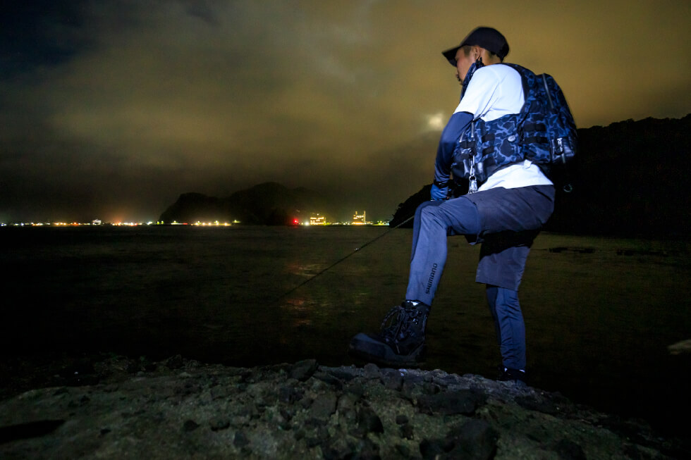 デイゲームを終えた二人は、松崎エリアにある地磯の1つに到着した。海に向かって突き出た岬の裏が大きなワンドになっている。