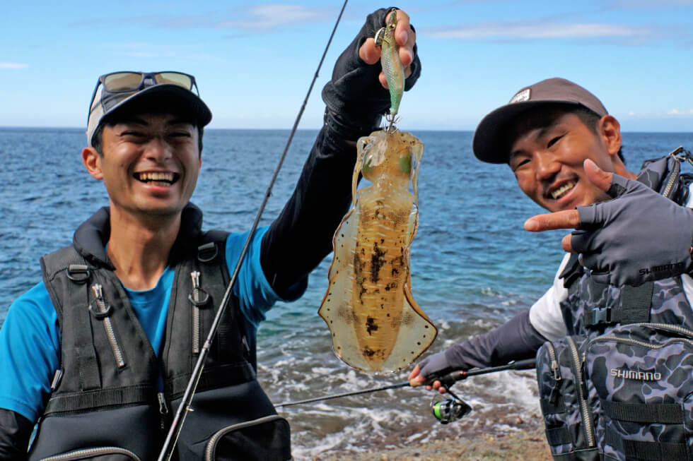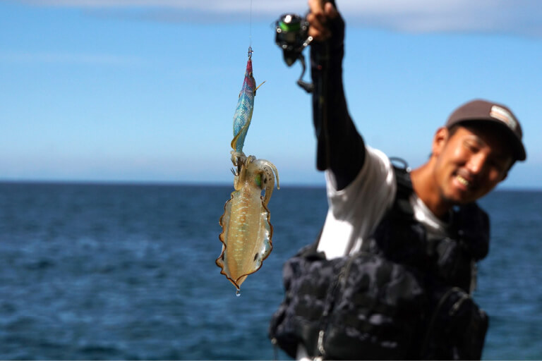 ちょうど潮も流れ始めましたね。沖にキャストしたエギが、しっかり流れに乗る感触があるから、その潮から外れないように漂わせてシャクっていけばきっと釣れますよ……ほら来た!