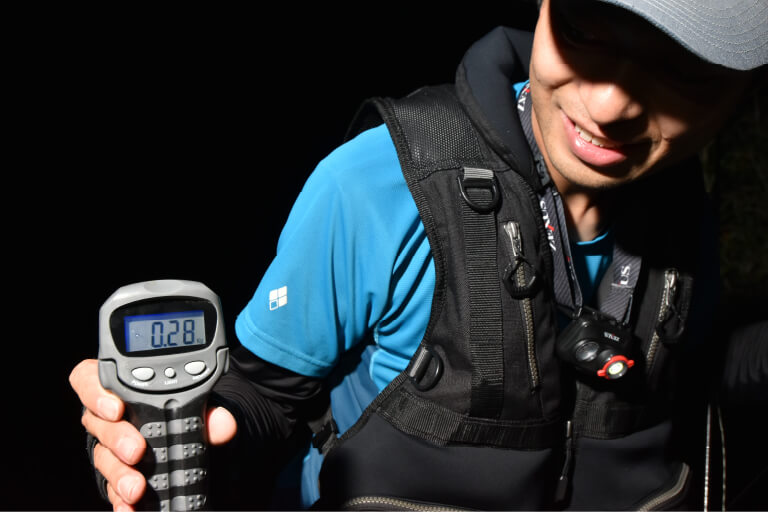 いやー、すごいです。アドバイスいただいたとおり「左沖に向けてキャストして、着水したら35秒カウント、3回シャクったら7秒沈めて潮から外さないようにする」で釣ってみたら、最初に気配があったけれど乗らず、でも次のシャクリで“ドスン”とイカの重さが乗りました。こんなイメージどおりのナイトエギングは初めてです!