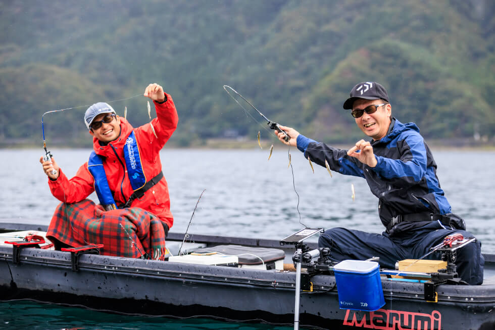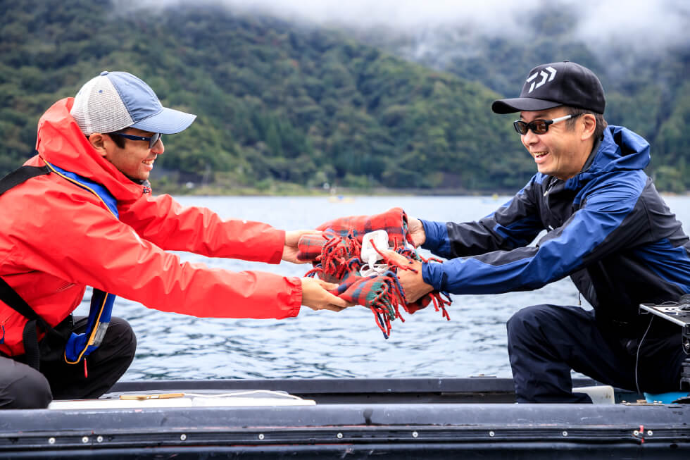 ポイントを決めたらアンカーを投入し、ワカサギやヒメマスの回遊がありそうな場所にボートを固定して釣り開始。ところどころに設置されている係留用のブイを利用することもできるのだが、この日は他のお客さんも多かったため、自分たちで選んだ場所にアンカーを入れて釣りをした