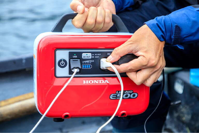LiB-AID E500はUSB出力端子2口と交流コンセント2口を搭載。今回はUSB出力端子1口から長島のスマホへ、交流コンセント2口から魚探と電気式のひざかけへそれぞれ給電した