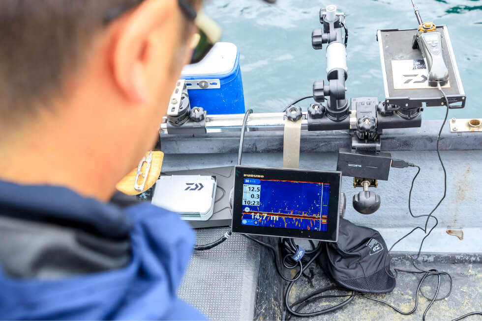 湖上に漕ぎ出た千島さんと長島はしばらく魚探をチェック。すると事前の情報どおり、沖合の深いポイントではほとんど反応がなく、岸から比較的近い水深12〜13mラインに魚と思われる影が頻繁に映るようになった。