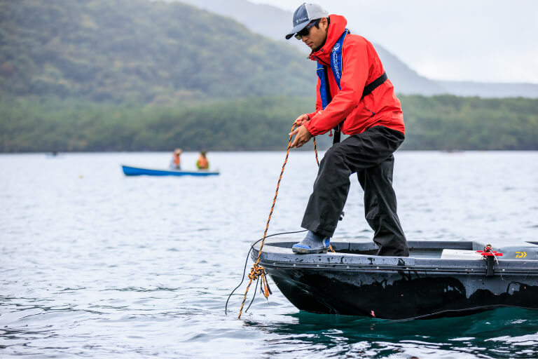 準備を済ませた千島さんと長島は同じボートで湖上に出た。八木も別のボートに乗り少し離れて二人を追走する。