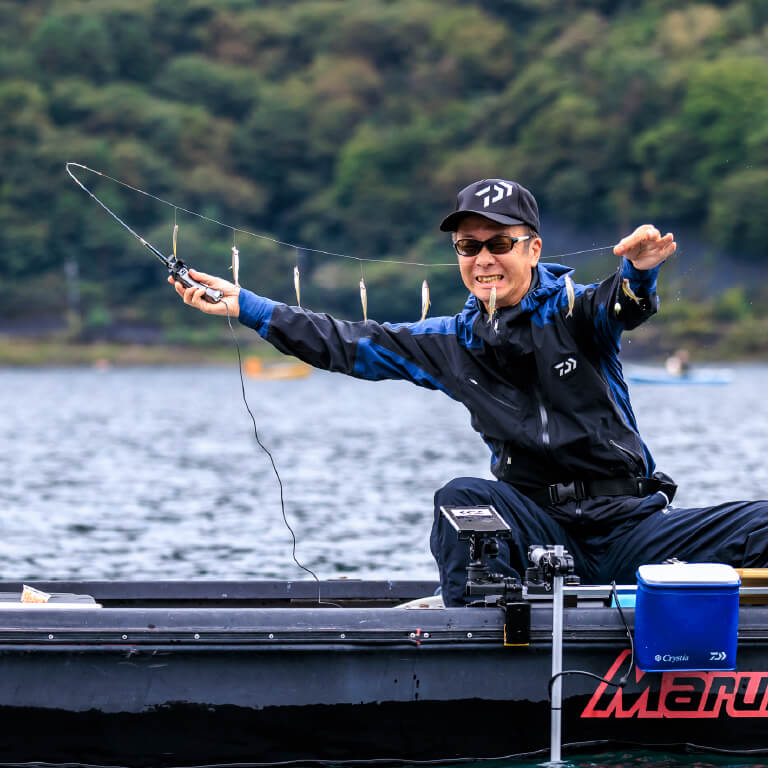 千島さんはワカサギ釣り用の電動リールを左右両手で操作。いわゆる電動二刀流でワカサギ釣りを開始。「ヒメマスは掛かる時に掛かる感じだと思うので、とにかくワカサギを釣る作戦です」