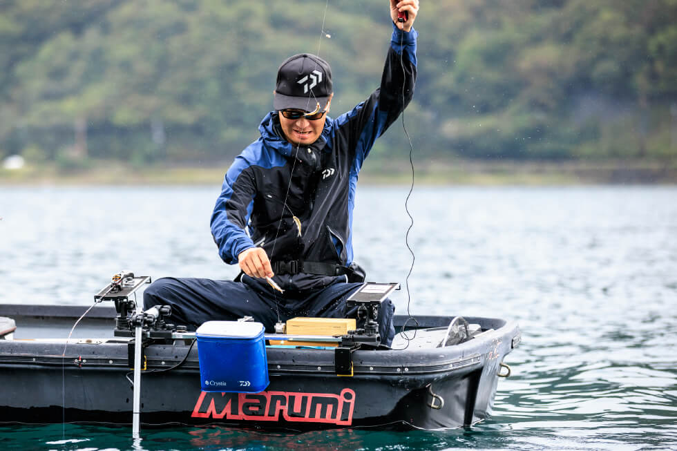 長島は少しでもリードを稼ぐためまずヒメマスをねらう。ただ、この日はヒメマスのご機嫌がかなり斜め。それらしき群れが映る水深に仕掛けを入れるのだが、なかなかアタリが出ない