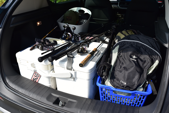 荷室には夏の釣りに欠かせないクーラー、ショアジギング用のタックル、砂浜を歩くシューズやライフジャケット、ウナギ釣り用の道具あれこれ、アウトドア用のチェアなどを積載。2人分一式を積み込んでもすっきり収まって腰も掛けられる(これが意外とラク)