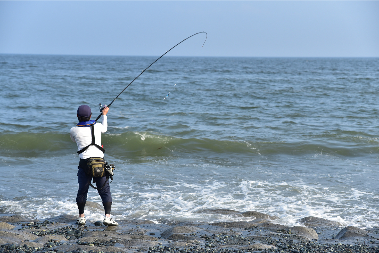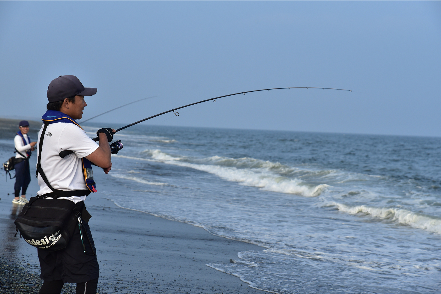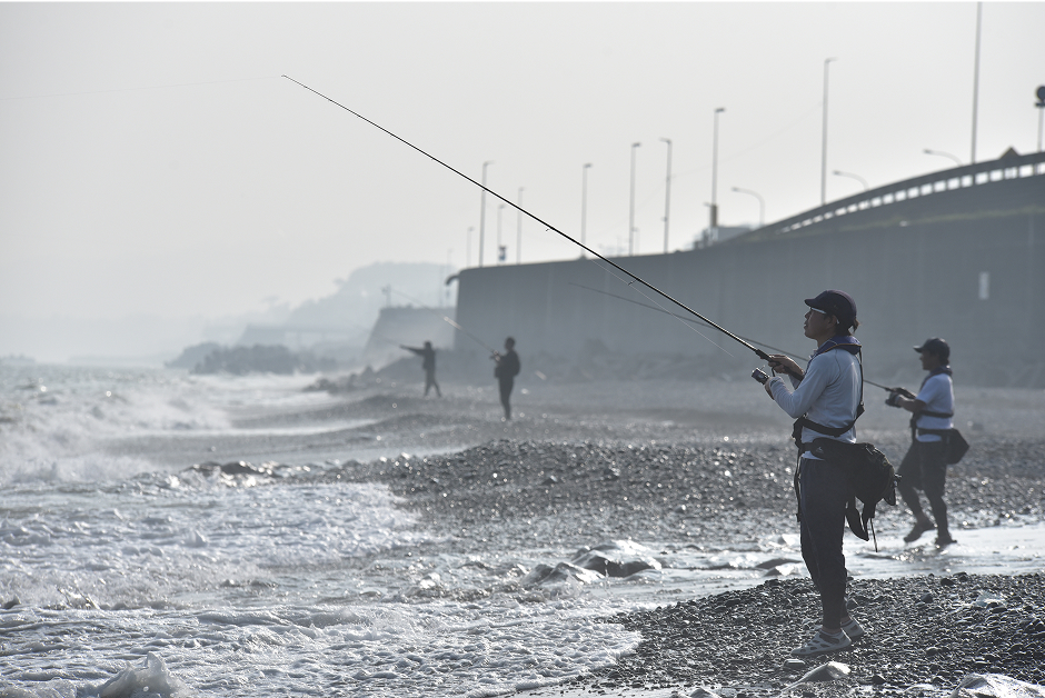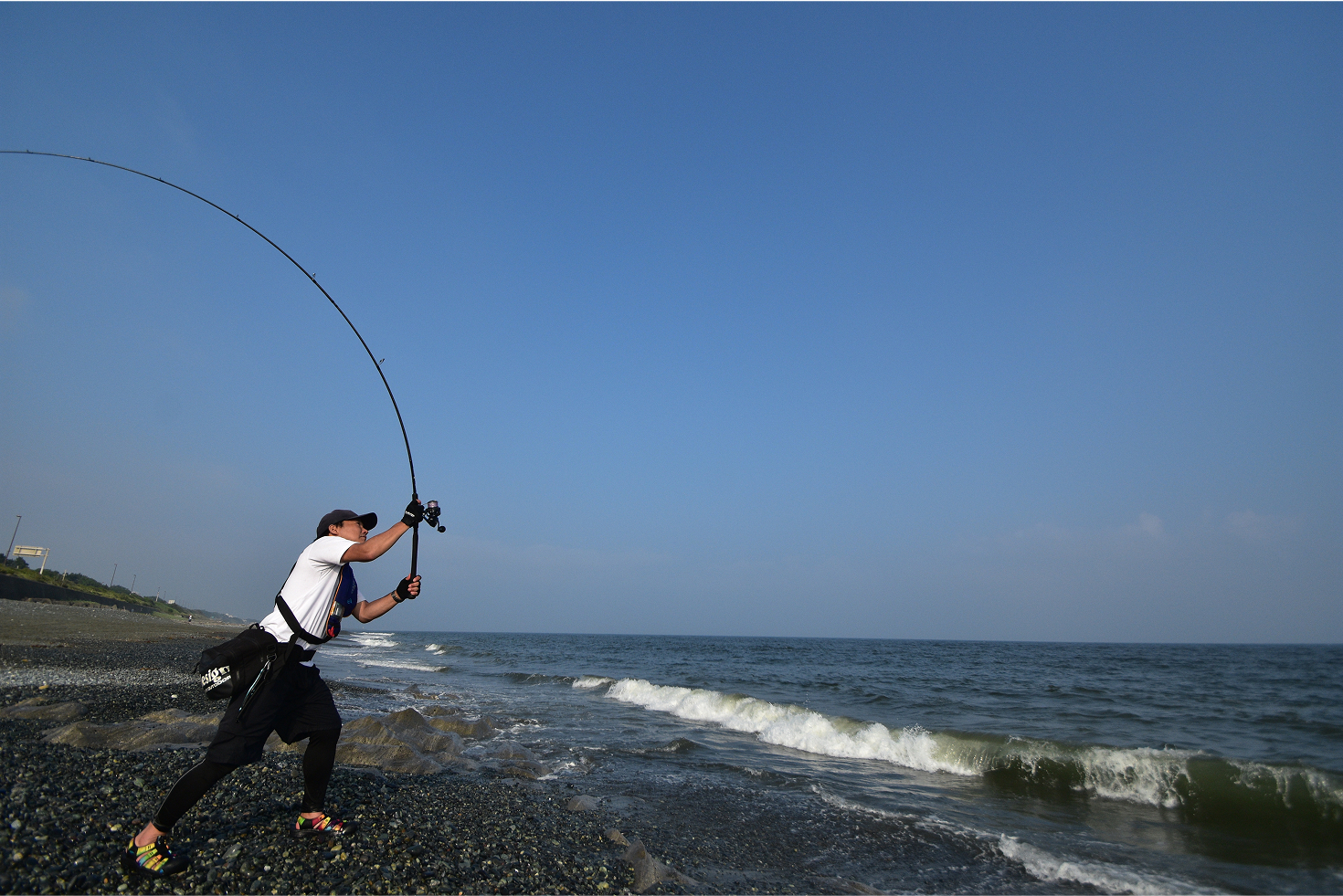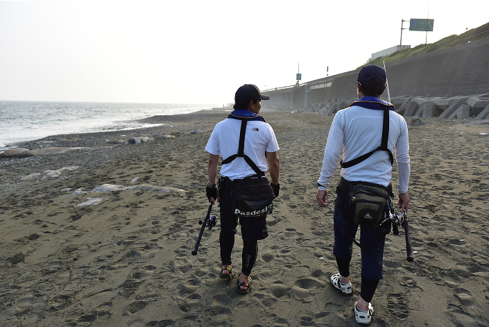 初日の夕方前は大磯海岸でライトショアジギングをまず開始! 西湘サーフのワカシねらいは朝が本命。具体的には日の出から朝8時くらいまでの数時間が時合になる。とはいえ、同じく光量が少ない夕方は、1日の中でもワカシが釣れるかもしれないチャンスタイム。あわよくばの釣果も期待しつつ、ウォーミングアップを兼ねてサオを振った