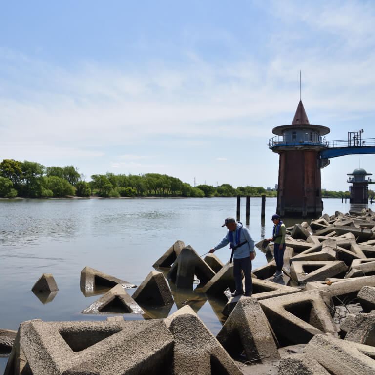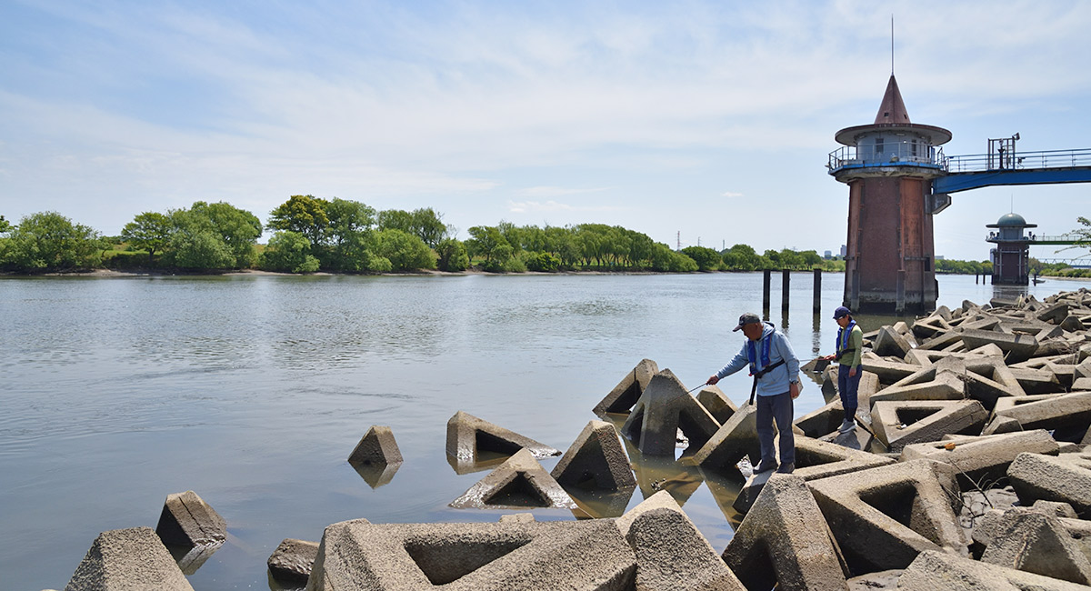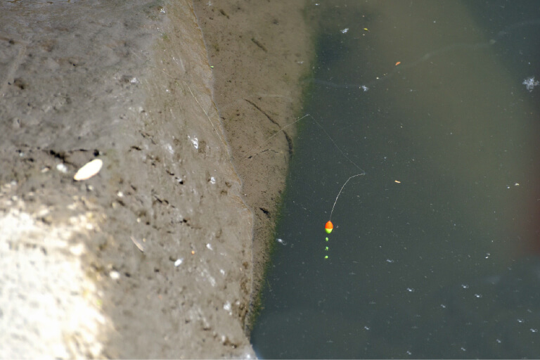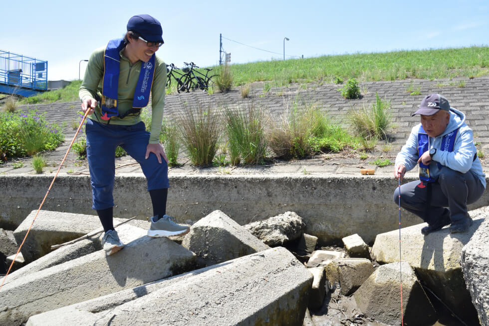タイプの違うエサも試しながら、テナガエビが潜んでいそうなブロックの陰に仕掛けを入れていく。テナガエビ釣りは複数人でサオをだすと探れるスポットも増える