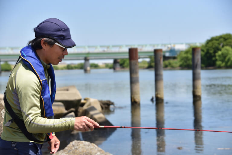 膝上から腿くらいまでの水深の場所をねらう。シーズン初期に短いサオでテンポよくテナガエビの居場所を探っていく場合、あまり深いところだとエビの反応が得にくい。浅めの場所をテンポよくチェックするほうがアタリを早く得られる