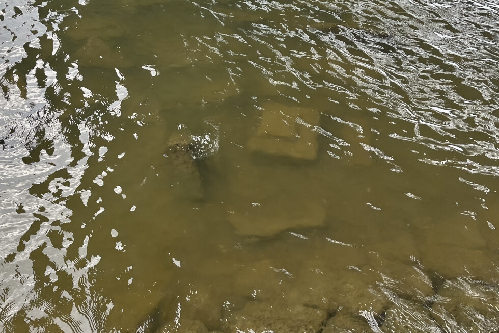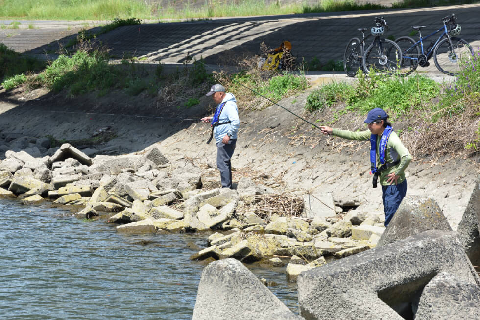 捨て石が入っている場所を選んで釣り再開! 水中の石がうっすらと見える濁り具合で雰囲気も悪くない。ちなみにテナガエビがいる河川の下流部は潮汐の影響を受けて水位が変わる。干潮で水位が低い時のほうがよく釣れるか、満潮で水位が高い時のほうがよく釣れるかは、ポイントによっても異なるので、もし初めての場所なら、潮位の変化が大きい大潮の時ではなく、より変化が穏やかな潮回りを選んで出かけてみるのも1つの手だ