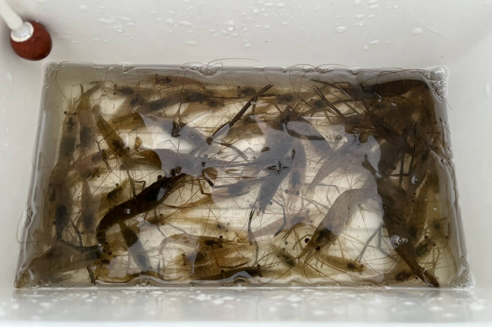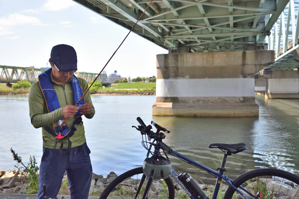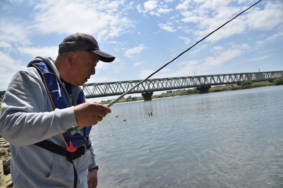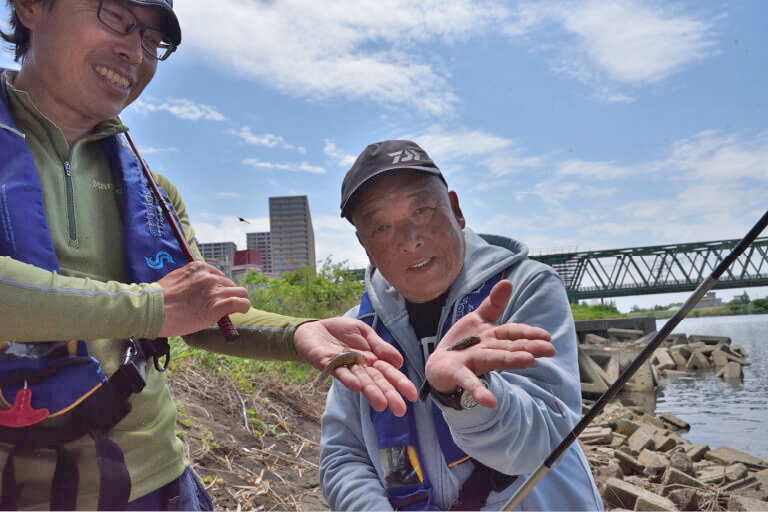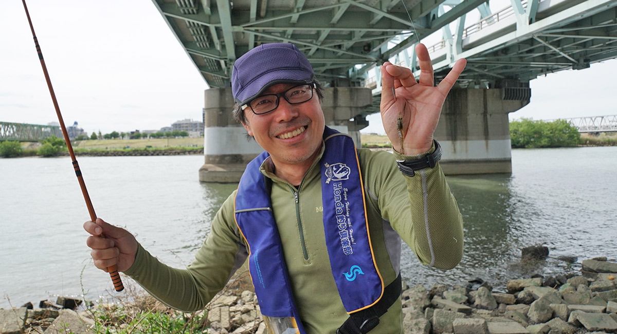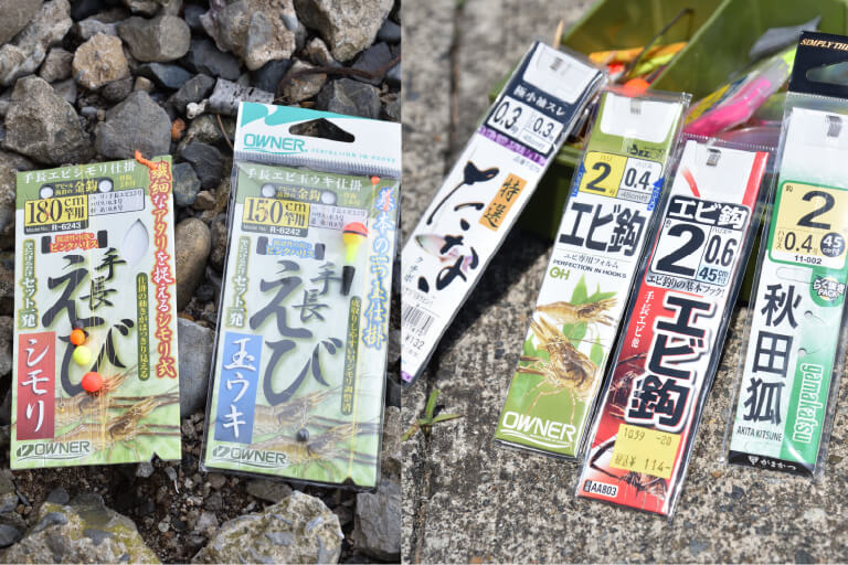 仕掛けは大川さんも八木も自作のウキ仕掛けだが、サオの長さに合わせた市販のテナガエビ仕掛けがあればよい。ハリはエビバリもよいが、シーズン初期のまだ釣れるサイズが小さい時は、ひとまわり小さいタナゴバリが活躍する。エサは釣具店で購入できるアカムシもしくはミミズ(ハサミでカットして使用)がおすすめだ