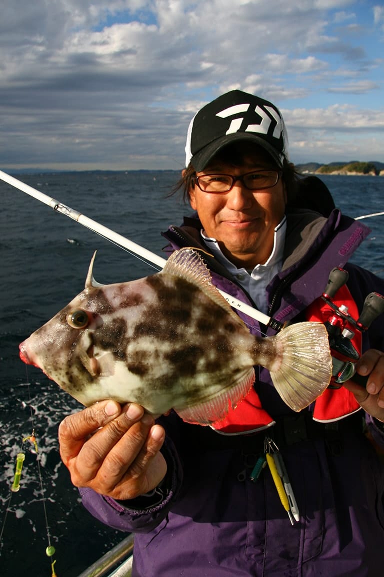 オモリを完全に底から離すため、中オモリは必要ない。いったんオモリを着底させてから、オモリを底から離したまま、サオ先を細かく上下させて小突くように誘い続ける。誘いのペースとストロークはカワハギの活性に合わせることが大事