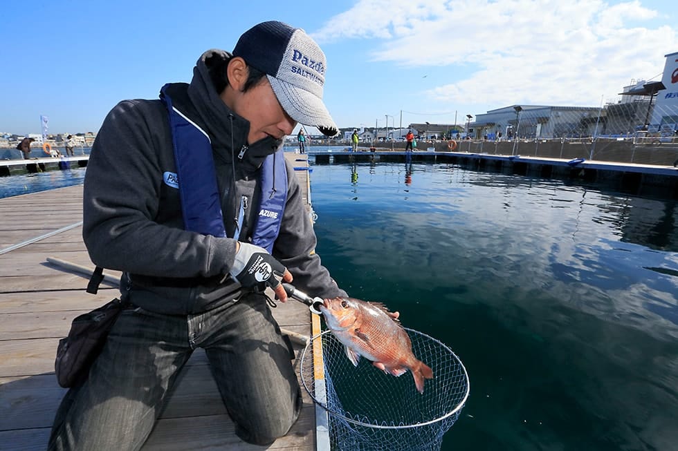 マダイの口は硬く噛まれると怪我をするので、ハリは必ずプライヤーやペンチで外す。手持ちがない場合は無理をせずスタッフに外してもらおう。釣った魚はランディングネットからフラシに移し、釣りが終わるまで生かしておく。