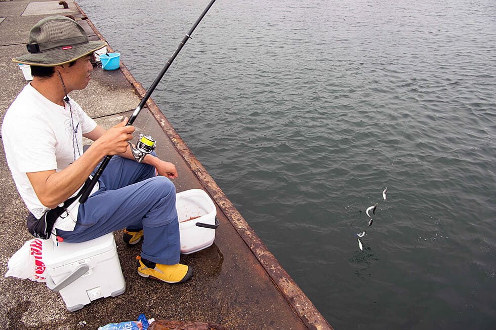 穂先が震え、振動が手に伝わるのですぐに分かる。1尾が掛かったら、しばらくそのまま、もしくはごくゆっくりと仕掛けを持ち上げるようにして、他のハリにも魚が食いつく追い食いを待ってからゆっくり一定の