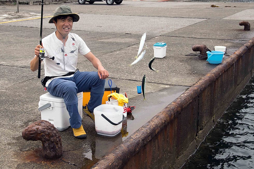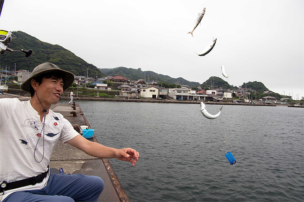 アタリと同時に魚がハリ掛かり。活性が高い時合には、待つ間もなく何尾もの魚がハリにヒットする多点掛けが楽しめる。