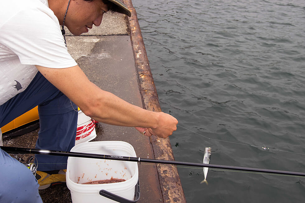 サビキ釣りをする時は、「逆サビキ」と呼ばれる、仕掛け下部にコマセカゴをセットする方法がやりやすい。釣り方はシンプル。コマセカゴに