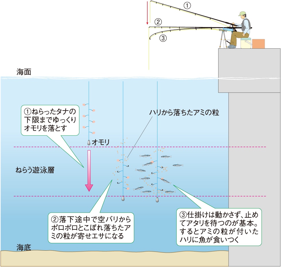釣り方は仕掛け下部のオモリを持ってイトを張り、寄せエサを入れた容器の中で前後に数回動かして空バリにアミの粒を引っ掛ける。その仕掛けをサビキ釣り(逆サビキ釣り)の時と同じように、ねらったタナまでゆっくりと落とし込む。すると、落下途中でハリ先から外れたアミの粒が寄せエサの代わりになり、なおかつまだアミの粒が残っているハリに直接魚が食いついてくる。